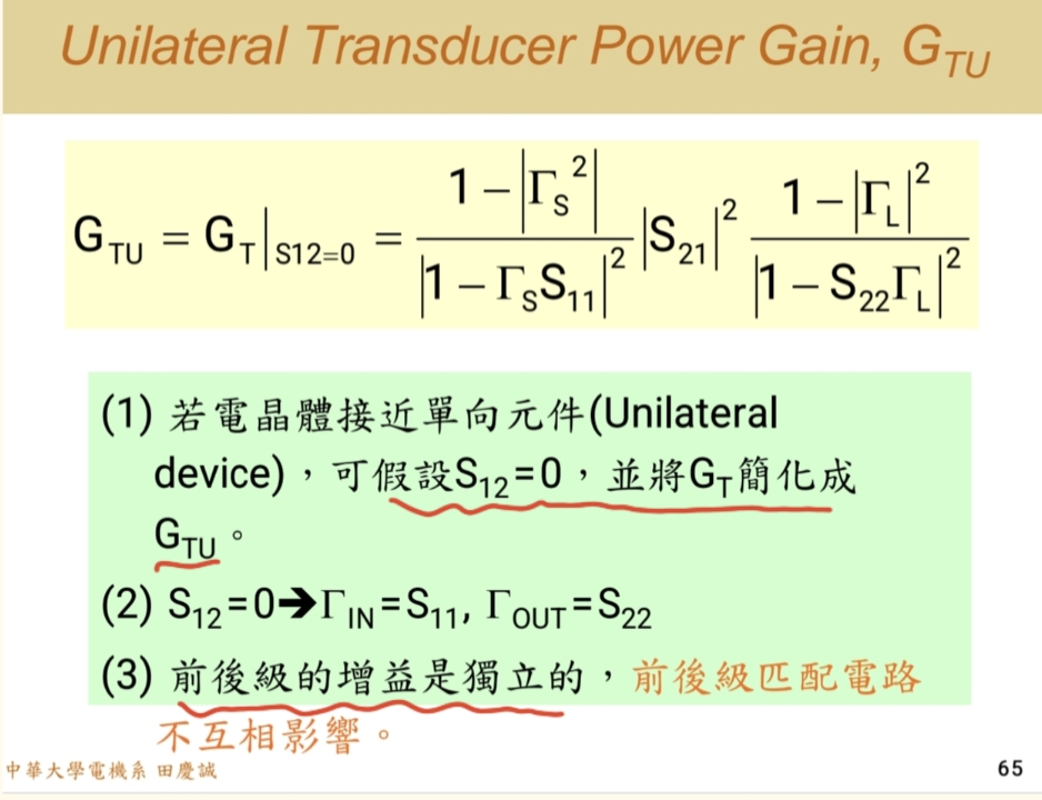 GTU=1−∣ΓS∣2∣1−S11ΓS∣2×∣S21∣2×1−∣ΓL∣2∣1−S22ΓL∣2\]\[ G_{TU} = \\frac{1 - \|\\Gamma_S\|\^2}{\|1 - S_{11}\\Gamma_S\|\^2} \\times \|S_{21}\|\^2 \\times \\frac{1 - \|\\Gamma_L\|\^2}{\|1 - S_{22}\\Gamma_L\|\^2}\]\[GTU=∣1−S11ΓS∣21−∣ΓS∣2×∣S21∣2×∣1−S22ΓL∣21−∣ΓL∣2