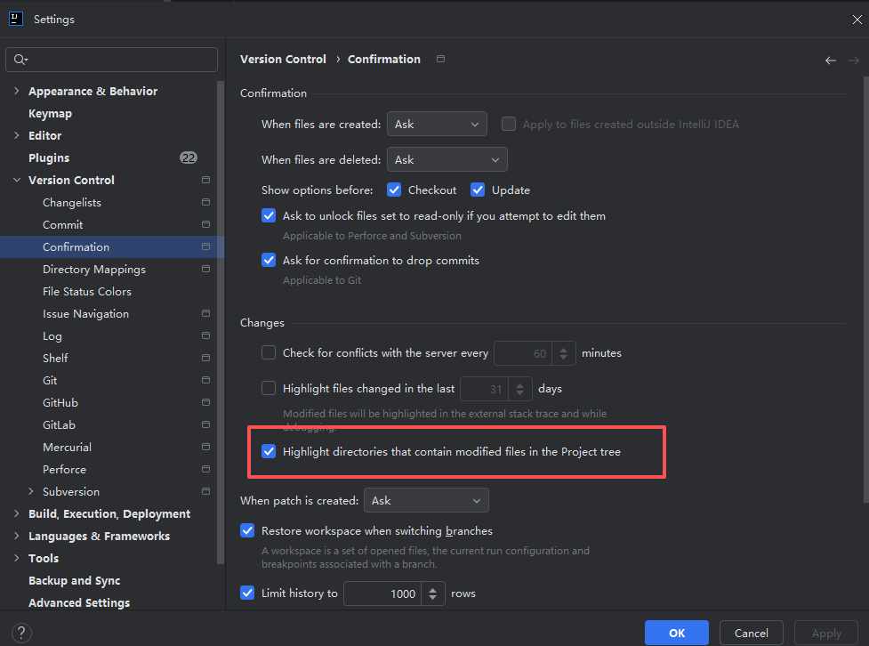 勾选Highlight directories that contain modified files in the Project tree,如下图: