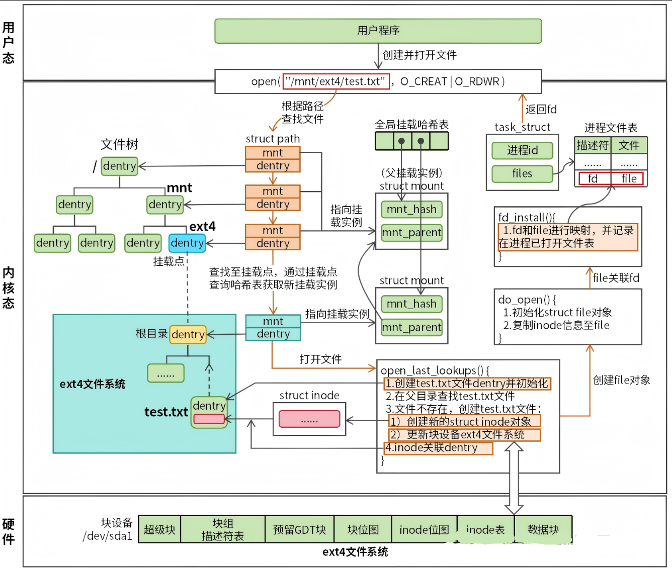 完成上述工作,用户程序还不能读写文件,用户程序读写文件需要用到文件描述符(fd)。内核会创建一个struct file对象,并将inode中的关键信息复制到file对象。然后申请一个未使用的fd,新fd关联file对象并记录在进程已打开文件表。最后,内核返回fd给用户程序,用户程序通过fd就能读写文件了。