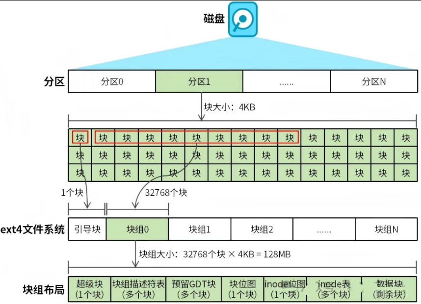 磁盘一个大容量的存储设备,为了更高效地使用磁盘的存储空间,我们需要将磁盘划分成块(如4KB),块是磁盘存储数据的最小单位,Linux系统以块为单位来读写磁盘。