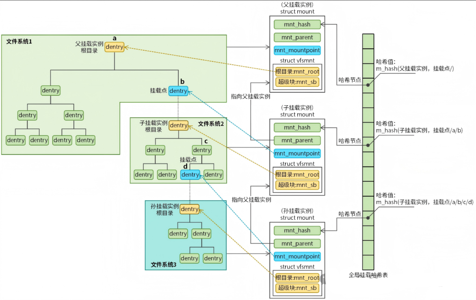 挂载实例之间呈父子关系,Linux系统根目录(/)所处的挂载实例为祖先挂载实例,挂载实例之间通过挂载点(父挂载实例中的一个目录(dentry))连接。