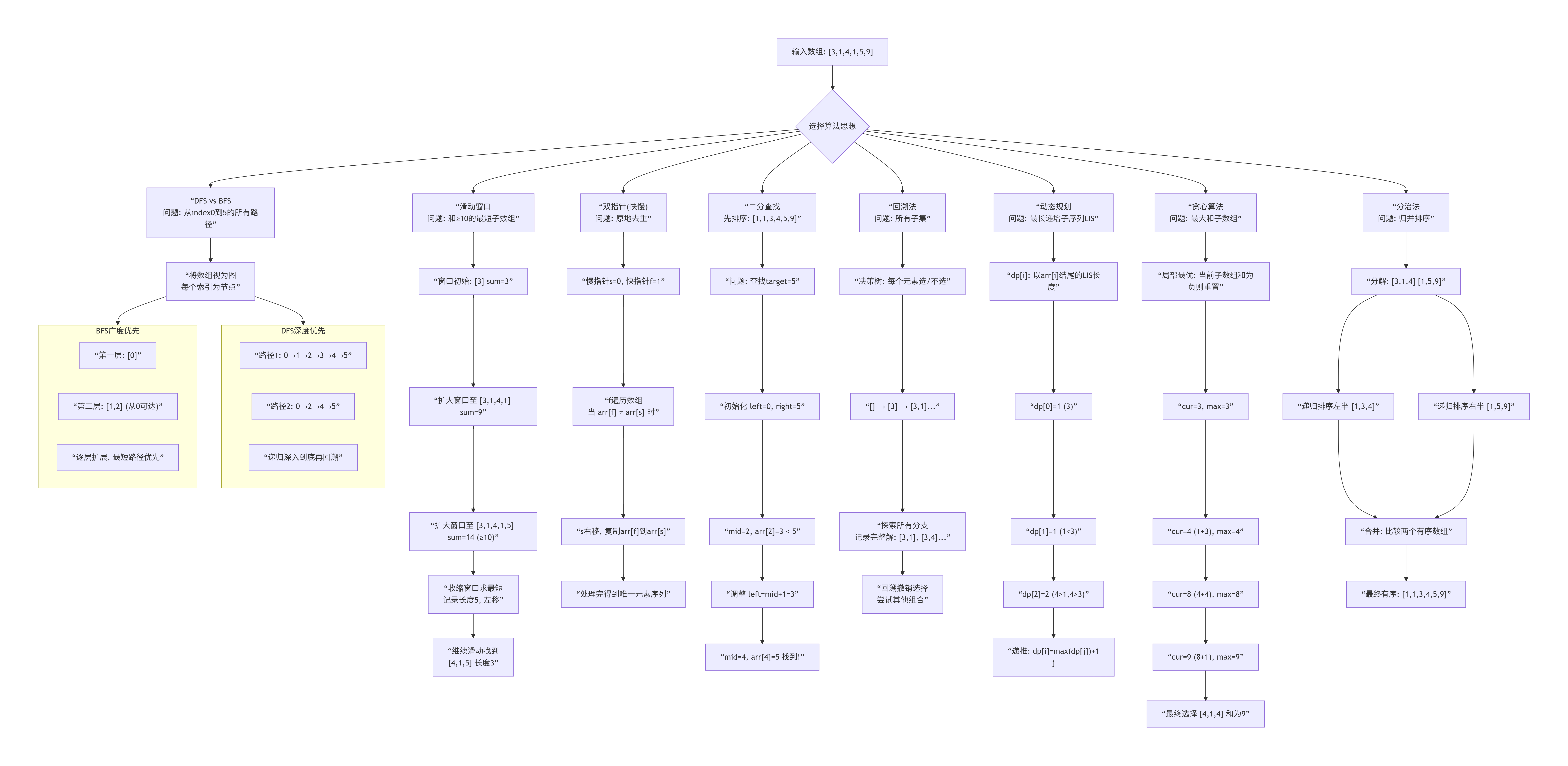 下面以数组 [3,1,4,1,5,9] 为例,展示滑动窗口、双指针、二分查找、DFS/BFS、回溯法、动态规划、贪心算法和分治法的核心思维差异:
