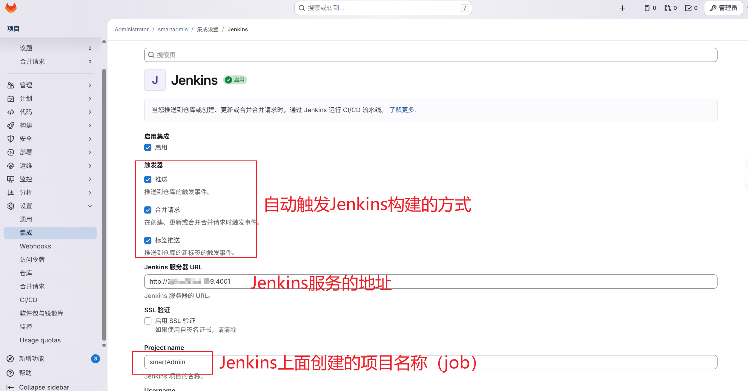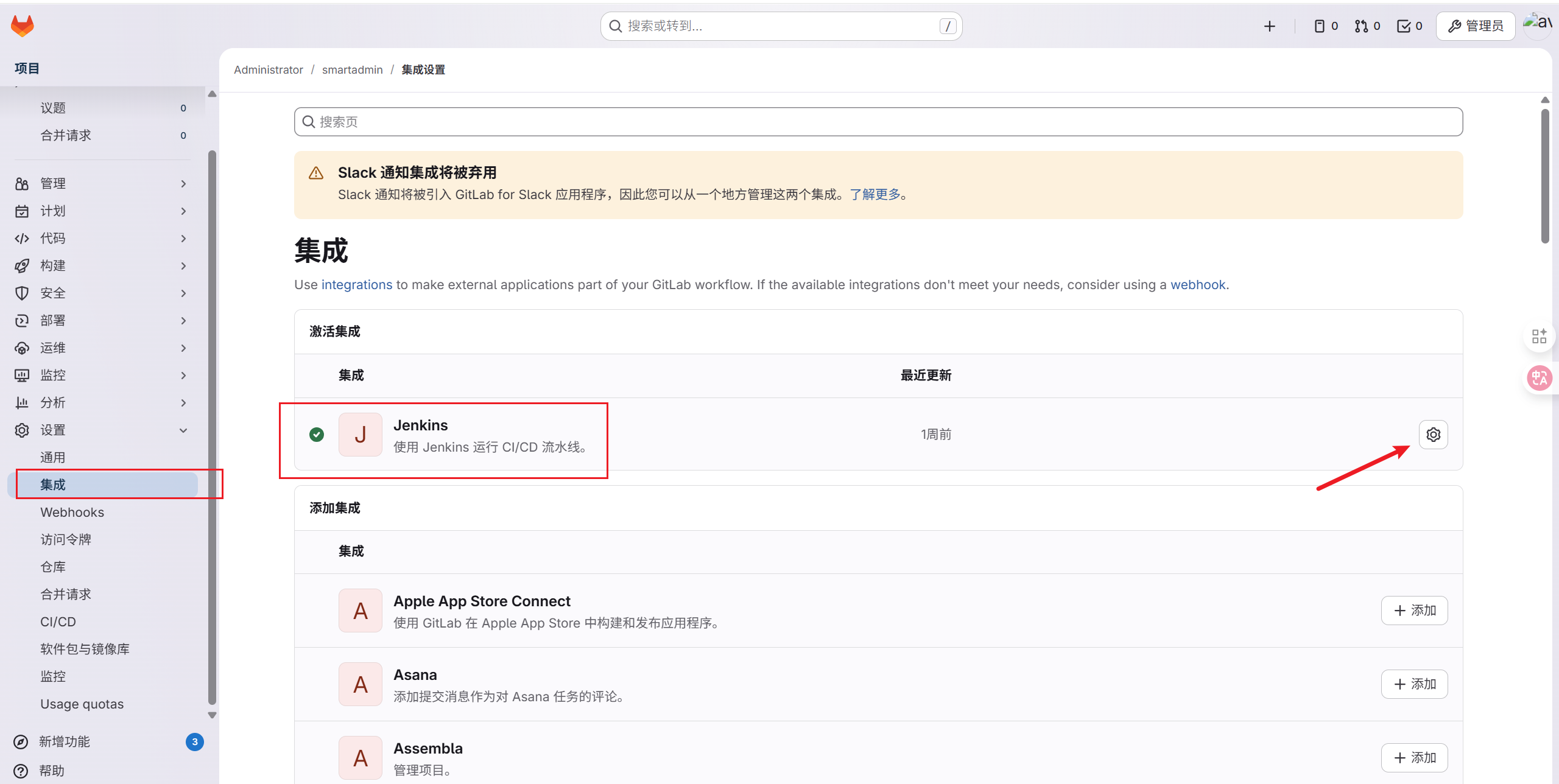集成中找到Jenkins,并进行配置: