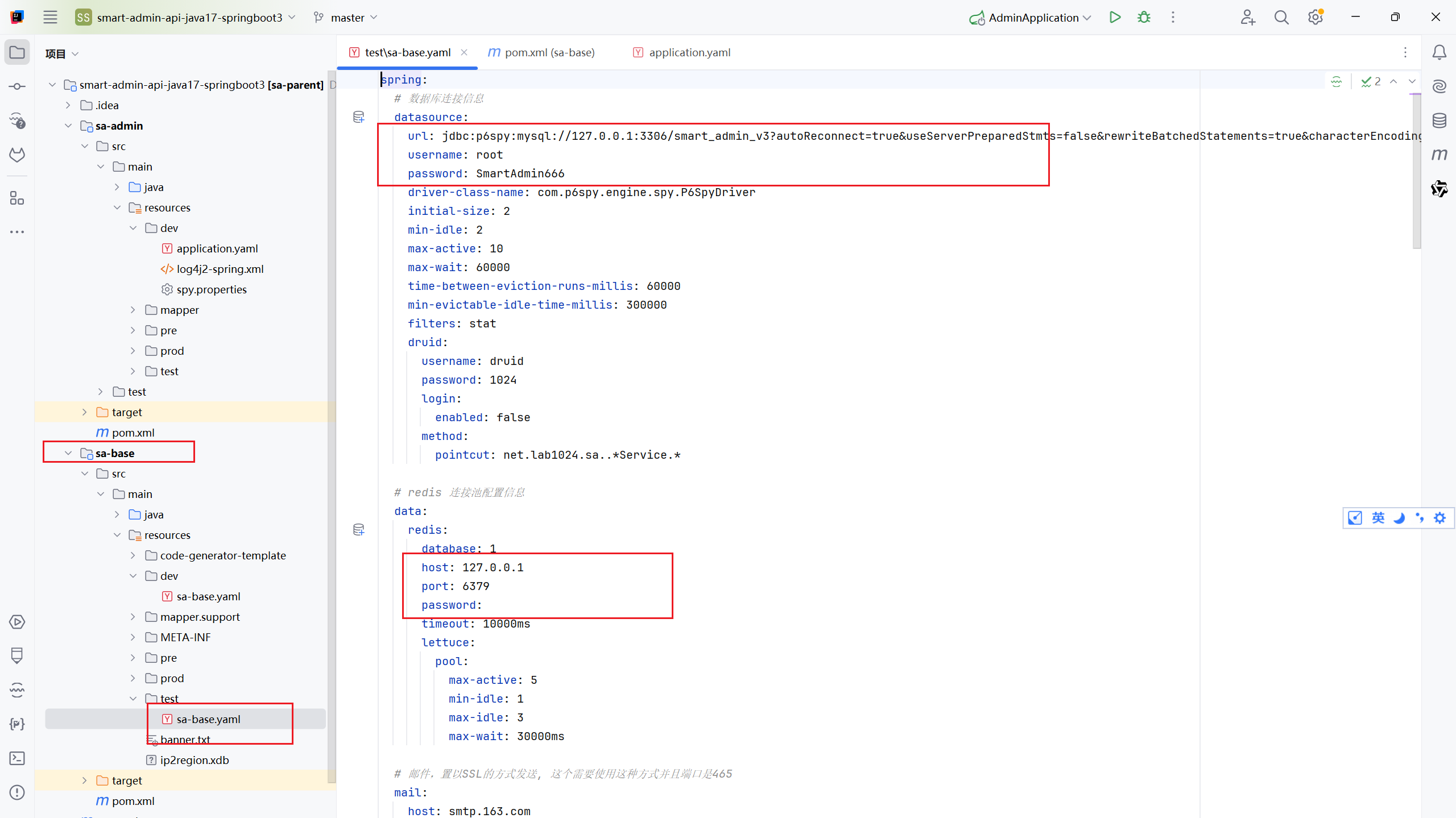 打包用的是test环境的配置,所以需要更改test后端配置的MySQL数据库链接、redis数据库链接等信息。以下这些信息,需要修改成自己服务器的IP、用户名和密码。
