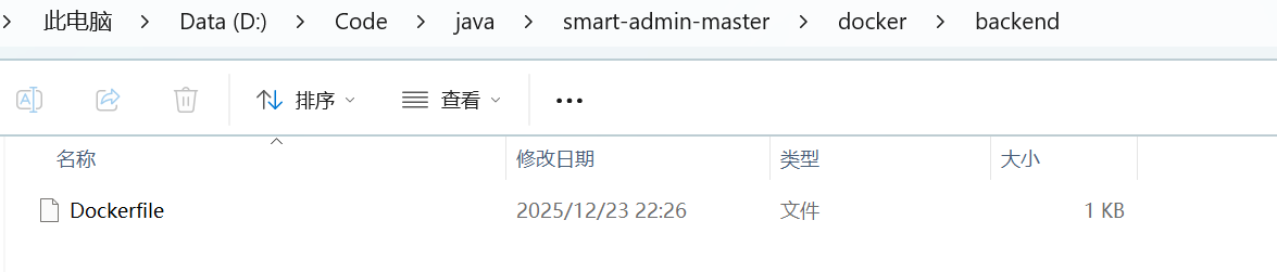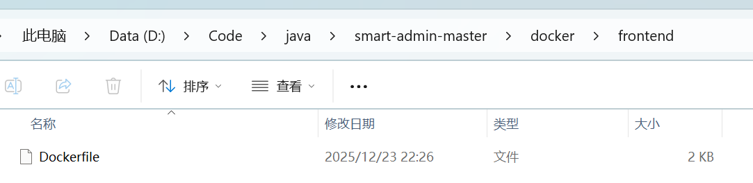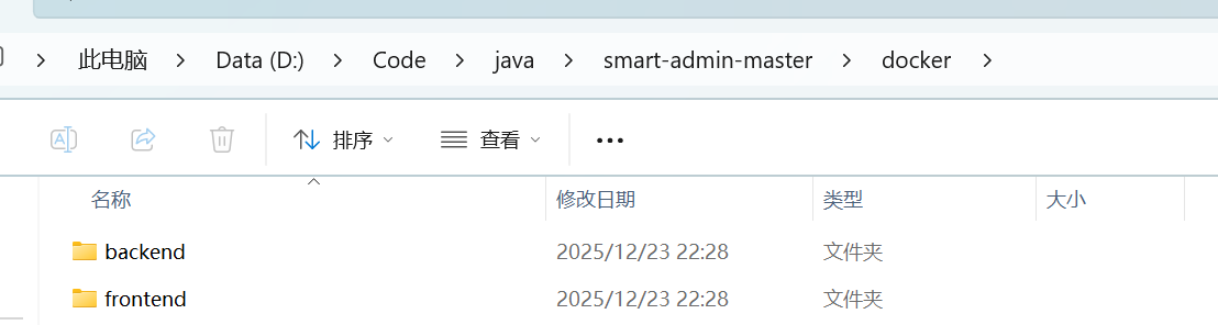 目录结构如图所示,在前后端项目的平级目录下面,创建docker文件夹,里面创建前后端两个文件夹,名称为:backend、frontend。在前后端文件夹中再分别创建名称为Dockerfile的文件(不是txt文件,文件没有后缀名)。
