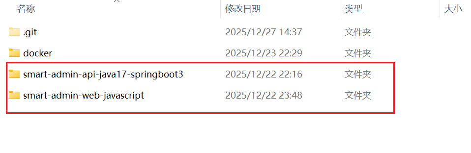 从官网拉取源代码后,保留smart-admin-api-java17-springboot3、smart-admin-web-javascript,其他删掉即可。