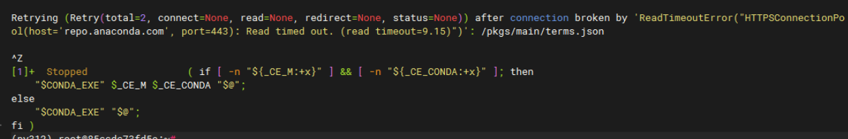 以为成功了,开始愉快的创建conda的虚拟环境,结果还是说超时: