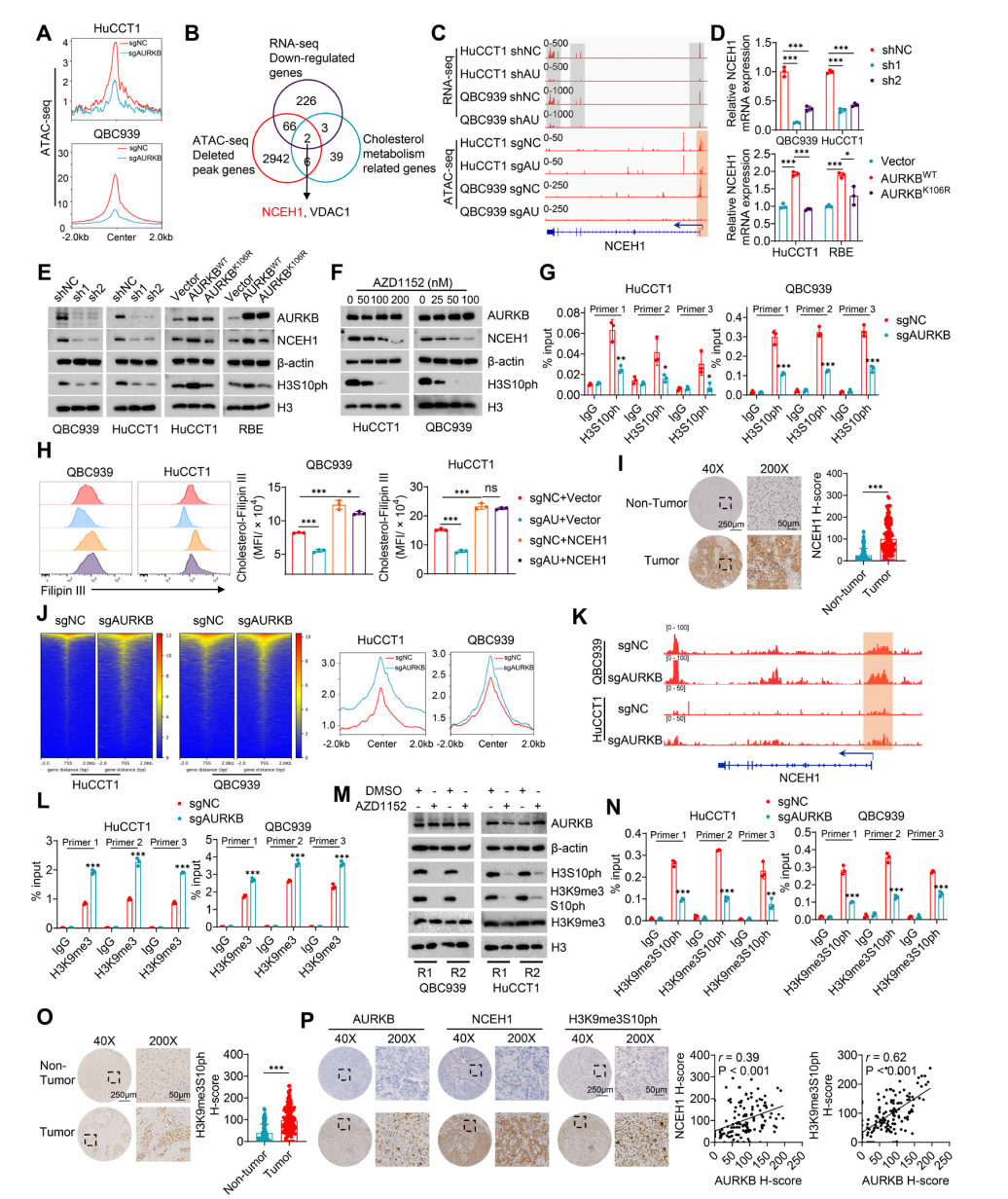 结合 ATAC-seq(染色质可及性测序)与 RNA-seq,筛选 AURKB 调控胆固醇代谢的下游靶基因;通过 ChIP-qPCR、CUT&Tag 测序验证 AURKB 通过组蛋白修饰(H3S10ph、H3K9me3、H3K9me3S10ph)调控 NCEH1 表达的分子机制;利用 NCEH1 过表达或敲低实验,验证其在 AURKB 介导的胆固醇调控及胆管癌进展中的作用。