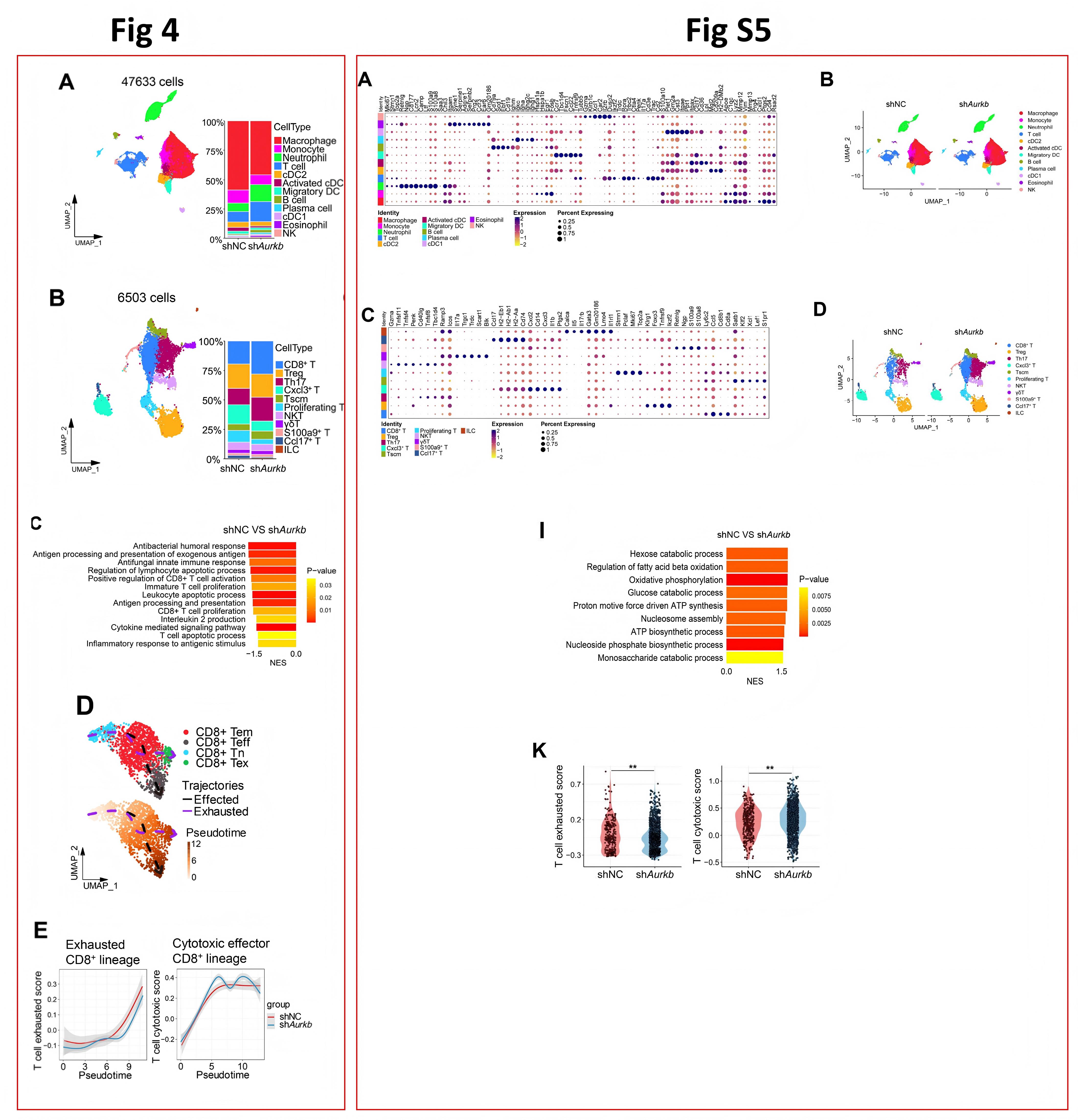 - 免疫细胞亚型分类与比例变化:通过 scRNA-seq 共鉴定出 12 种免疫细胞亚型(包括 T 细胞、巨噬细胞、单核细胞、粒细胞等),发现 shAurkb 组 CD8+ T 细胞比例显著升高,巨噬细胞及单核细胞比例降低(图 4A,补充图 S5A-B);对 T 细胞进一步分群,鉴定出 11 个 T 细胞亚型,其中 CD8+ T 细胞为主要群体,且 shAurkb 组效应 CD8+ T 细胞(TE)比例升高,耗竭 CD8+ T 细胞(TEX)比例降低(图 4B,补充图 S5C-D)。