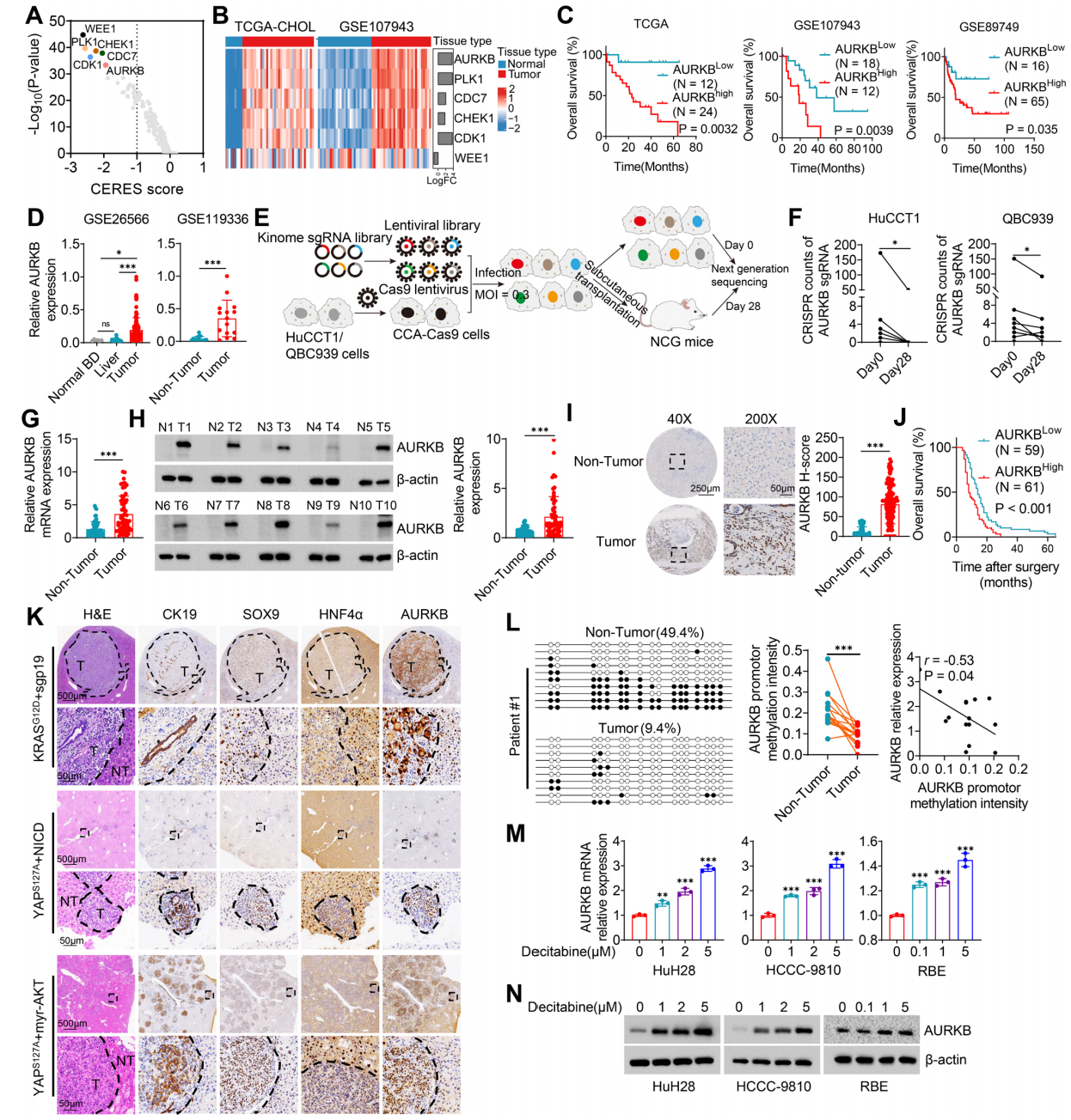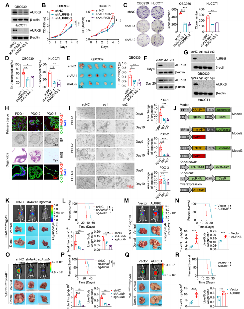 - 临床样本验证显示,AURKB 在胆管癌组织中高表达,癌旁正常组织中几乎不表达,且其表达水平与患者术后复发风险呈正相关(图 1G-J);HTVi 诱导的小鼠胆管癌模型(KRASG12D/sgp19、YAPS127A/myr-AKT 等)进一步证实 AURKB 仅在肿瘤组织中特异性表达(图 1K)。