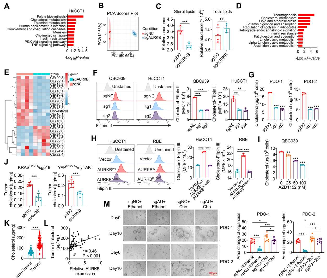 - 临床样本及动物模型验证显示,胆管癌组织中胆固醇水平显著高于癌旁组织(图 3K),且与 AURKB 表达呈正相关(图 3L);胆固醇补充可缓解 AURKB 敲除对类器官生长的抑制作用(图 3M),证实 AURKB 通过促进肿瘤内游离胆固醇生成推动胆管癌进展。