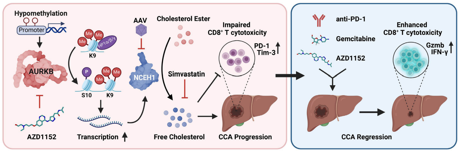胆管癌(CCA)是致死率高且发病率持续上升的恶性肿瘤,现有治疗手段疗效有限,亟需发掘新型治疗靶点。本研究通过sgRNA 文库筛选 鉴定出 Aurora 激酶 B(AURKB)为胆管癌关键治疗靶点,结合多组学测序、临床样本验证 及临床前模型实验,阐明了 AURKB 通过催化组蛋白 H3 赖氨酸 9 三甲基化(H3K9me3)/ 丝氨酸 10 磷酸化(H3S10ph)修饰,降低 H3K9me3 在中性胆固醇酯水解酶 1(NCEH1)启动子区的富集,进而上调 NCEH1 表达并增加肿瘤内胆固醇水平的分子机制;AURKB 高表达与胆管癌患者新辅助化疗免疫治疗预后不良相关,且与肿瘤内胆固醇积累密切关联。临床前研究证实,AURKB 抑制剂或辛伐他汀可抑制胆管癌进展,并显著增强化疗免疫治疗敏感性,为胆管癌治疗提供了 "靶向 AURKB" 或 "降低肿瘤胆固醇" 的新型策略。