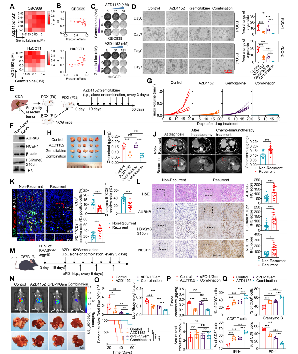 评估 AURKB 抑制剂 AZD1152 与化疗药物(吉西他滨、顺铂)的协同抗肿瘤效应,通过 CI(Combination Index)分析验证药物协同作用;在皮下移植瘤、PDX(患者来源异种移植)模型中验证 AZD1152 与化疗、免疫治疗(抗 PD-1 抗体)的联合治疗效果;探究他汀类药物(辛伐他汀)在胆管癌治疗中的应用价值,验证其对肿瘤胆固醇及化疗免疫治疗敏感性的影响。