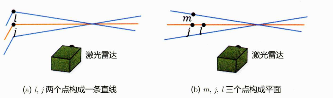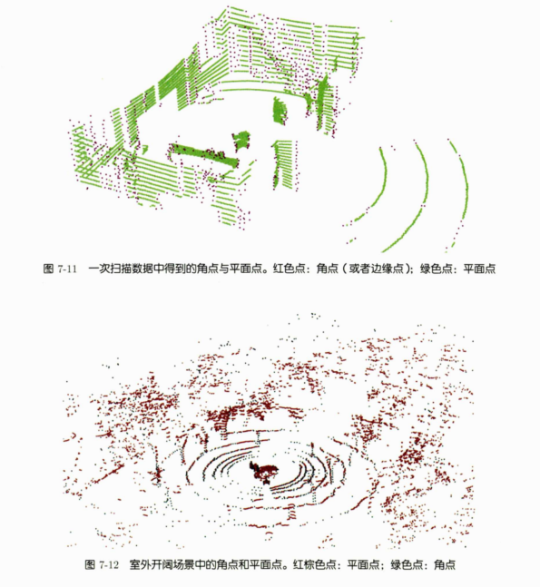 在室内结构环境中,角点和平面点可以被准确地提取。角点通常分布于建筑物的棱上,平面点则位于建筑的面上。对于室外开开阔场景,平面点通常效果较好,角点稍微差一些。另外地面上的点通常不呈直线分布,而是呈圆周分布。(激光雷达多采用旋转式扫描方案,相当于在空间中形成无数个同轴的圆锥面 。当这些圆锥面与平坦的地面相交时,交线就是一个个同心圆,对应到点云上就是呈圆周分布的地面点。)