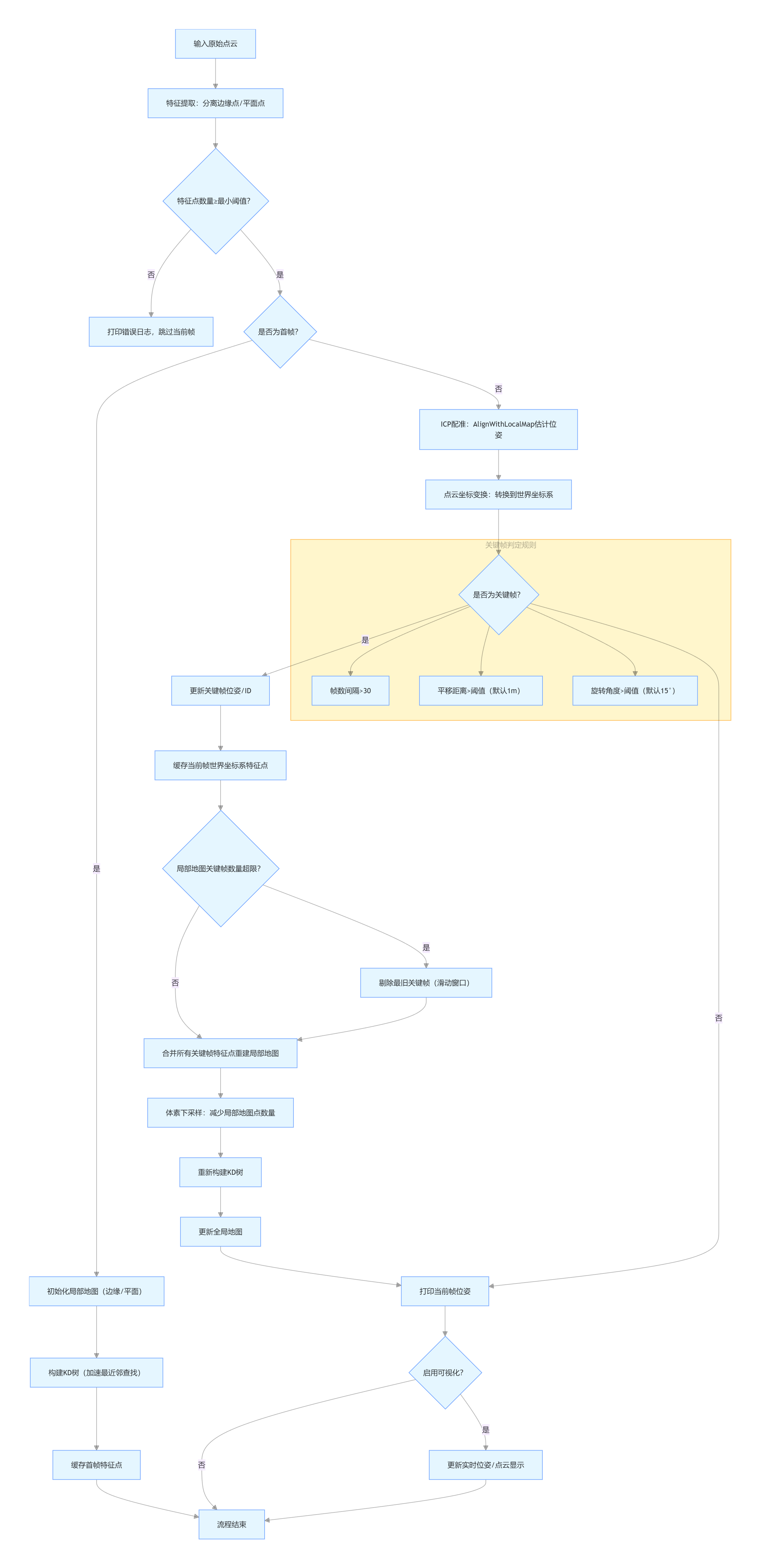 * @brief 处理单帧原始点云,完成特征提取、配准、位姿估计全流程