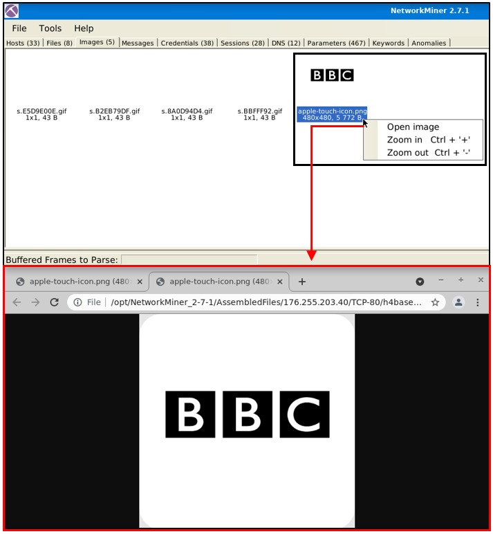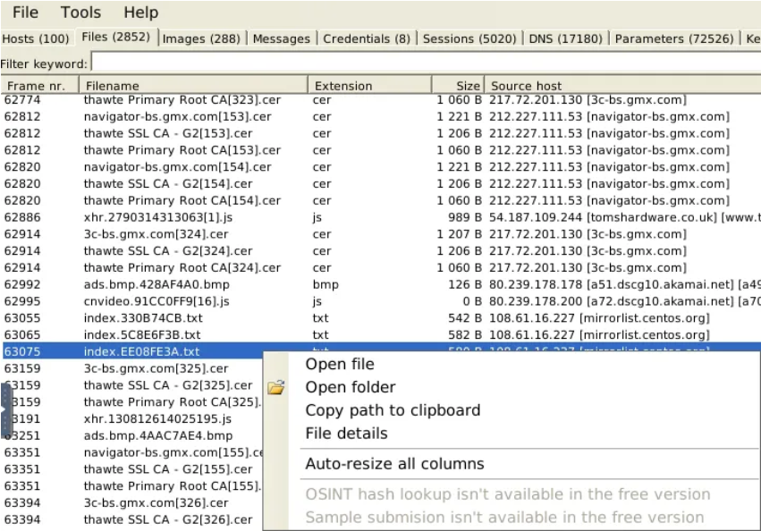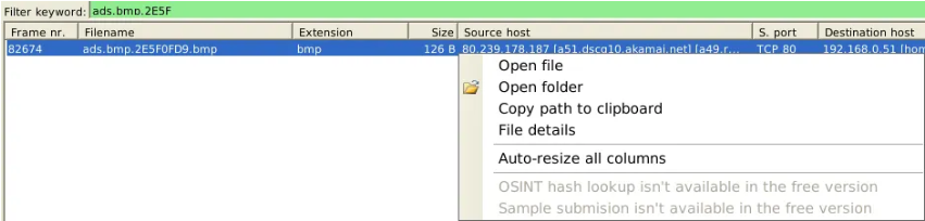文件菜单显示从分析的 pcap 文件中提取的图像。右键菜单在这里也很有用。您可以轻松打开文件并放大缩小。