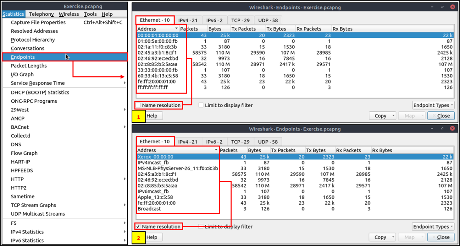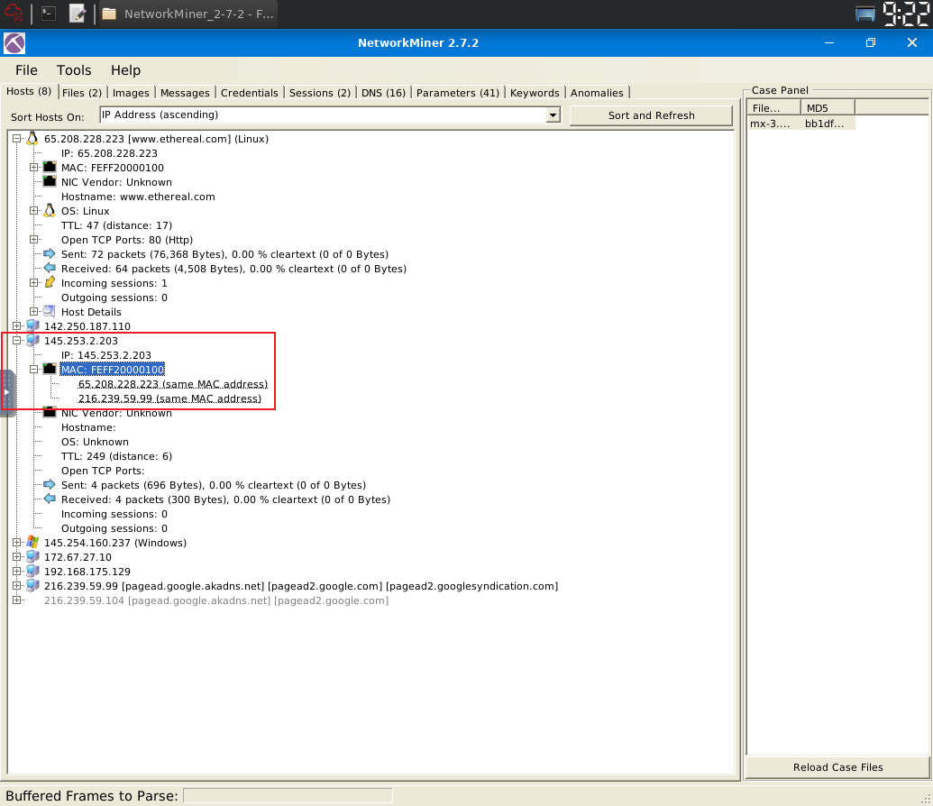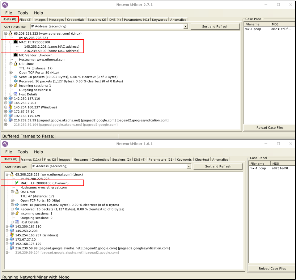 NetworkMiner 2 及更高版本可以处理 MAC 地址关联,如下图所示。此选项可帮助您识别是否存在 MAC 地址冲突。2 及更早版本不具备此功能。