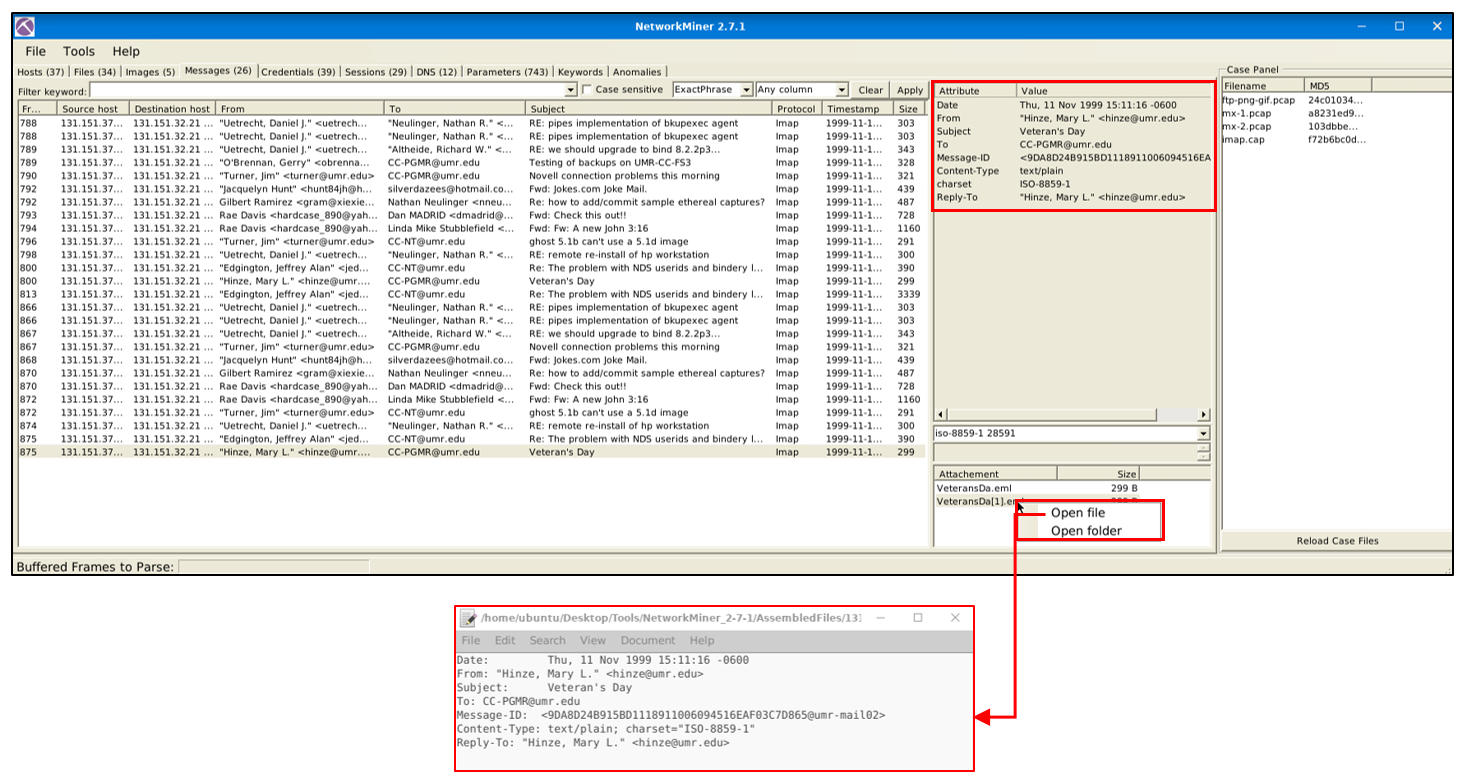 筛选流量并找到匹配项后,您将看到所选邮件的更多详细信息,例如附件和属性。请注意,此处也提供搜索栏。右键菜单也在此处可用。您可以使用内置查看器查看整体信息,并使用"打开文件"选项浏览附件。
