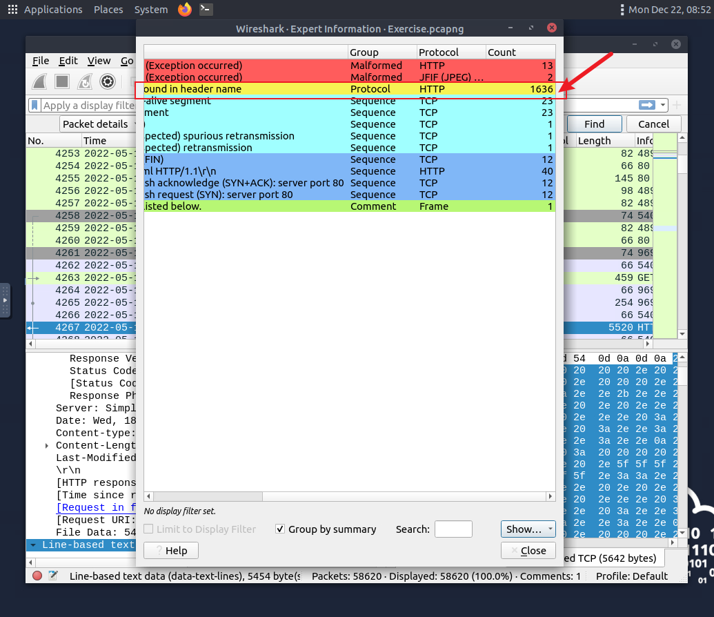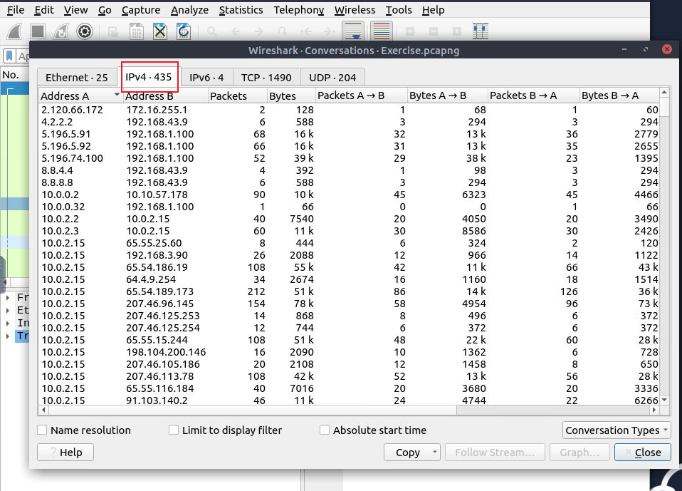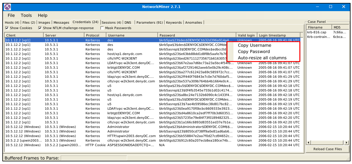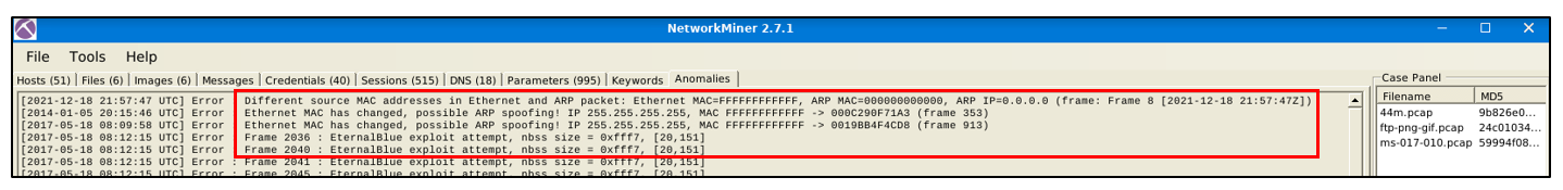 异常菜单会显示已处理pcap文件中检测到的异常。请注意,NetworkMiner 并非入侵检测系统(IDS)。但是,开发者添加了一些针对 EternalBlue 漏洞利用和欺骗攻击的检测功能。