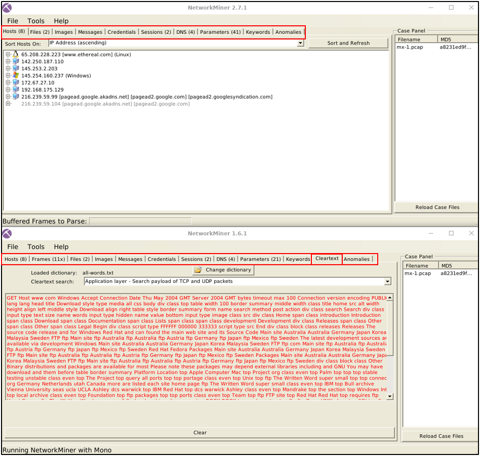 NetworkMiner 1.6 及更早版本可以处理明文数据。此选项会在单个标签页中显示所有提取的明文数据,便于分析流量数据的明文信息。但是,无法将明文数据与数据包进行匹配。1.6 及更高版本不再提供此功能。