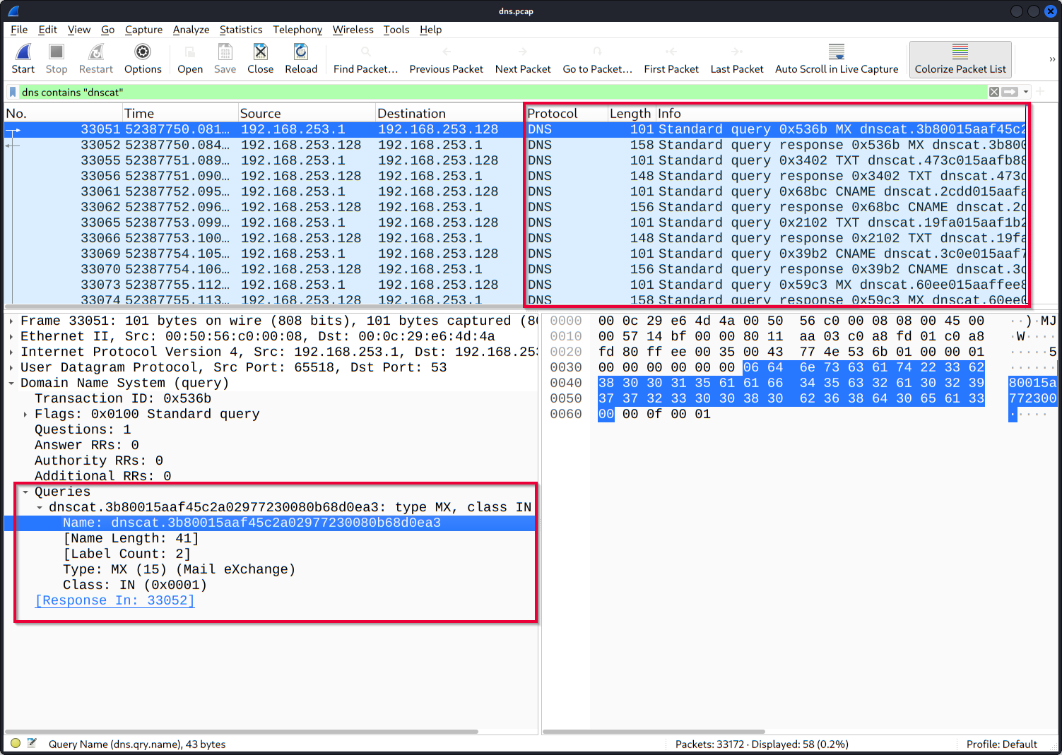 这种情况充分说明了为什么我们需要网络流量分析。防火墙和其他设备会记录 DNS 查询及其响应,但不会记录其内容。例如,攻击者可以利用 TXT 记录向受感染的系统发送命令与控制 (C2) 指令。我们可以通过检查 DNS 查询的内容来发现这一点。下面的数据包捕获片段显示了一个包含 C2 命令的 DNS 响应的内容。