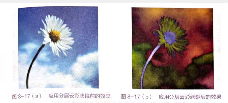 分层云彩滤镜使用随机生成的介于前景色与背景色之间的值来生成云彩图案,产生类似负片的效果。此滤镜和云彩滤镜的区别就是该滤镜会产生的云彩图案和图像已有的图像以差值模式混合,产生一种特殊的混合效果。此滤镜不能应用于 Lab 色彩模式的图像。运用分层云彩滤镜前后的不同效果如图 8-17 所示。