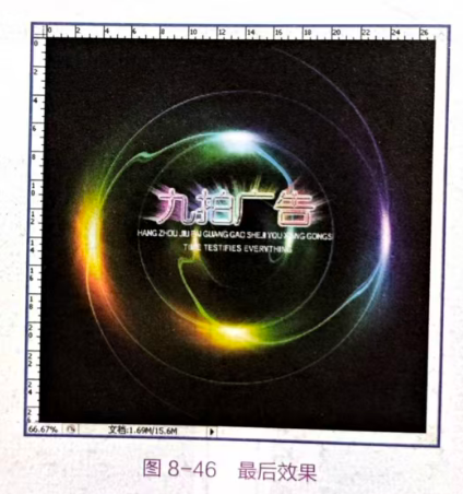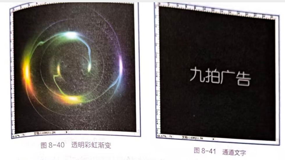 (13)将通道转化为选区,回到图层面板,新建一个图层,调整好选区的位置,用 "透明彩虹" 的线性渐变进行填充,效果如图 8-45 所示。