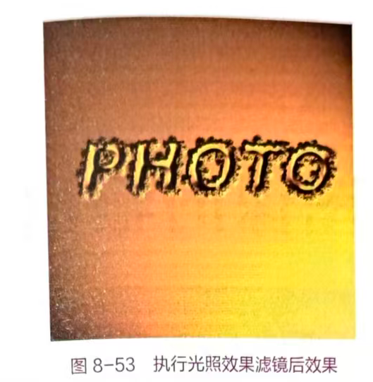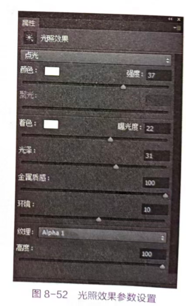 (13)执行 "滤镜 --- 渲染 --- 光照效果" 菜单命令,参数设置如图 8-52 所示。注意:纹理通道中选 Alpha 1 通道。