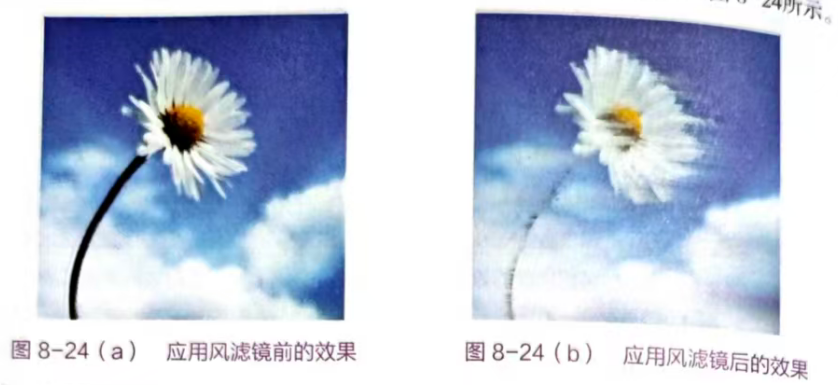 风滤镜在图像中色彩相差较大的边界上增加细小的水平短线来模拟风的效果。其调节参数为三种强度的风效,风:细腻的微风效果;大风:比风效果要强烈得多,图像改变很大;飓风:最强烈的风效果,图像已发生变形。运用风滤镜前后的不同效果如图 8-24 所示。