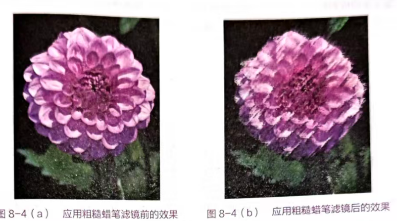 粗糙蜡笔滤镜通过在图像中增加彩色线条和纹理,使图像产生不同纹理浮雕的质地效果。在滤镜参数设置对话框中,线条长度和线条细节用来控制笔画的力度和细节;在纹理的下拉框中可选择预设的不同纹理;还可以在光照方向下拉选择框中选择光线照射的不同方向;当选择反相时可反转纹理表面的亮色和暗色。运用粗糙蜡笔滤镜前后的不同效果如图 8-4 所示。