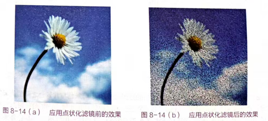 点状化滤镜将图像分解为随机分布的网点,模拟点状绘画的效果。使用背景色填充网点之间的空白区域,主要通过设置单元格大小来调整单元格的尺寸,来控制网点的尺寸,范围是 3 到 300。值越大,网点尺寸越大。运用点状化滤镜前后的不同效果如图 8-14 所示。