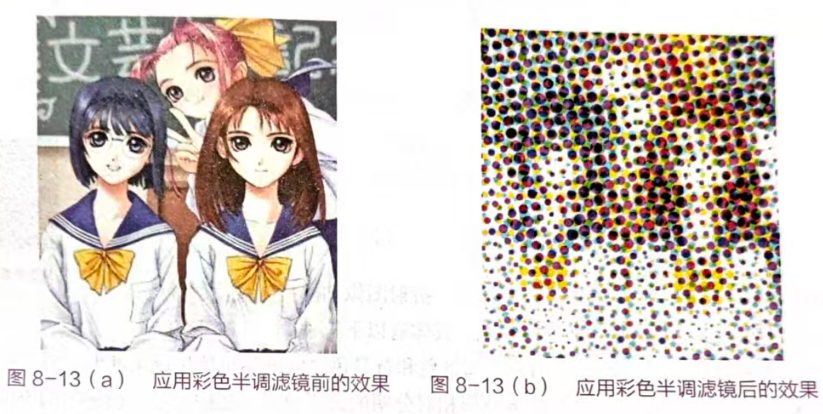 彩色半调滤镜模拟在图像的每个通道上使用放大的半调网屏的效果。对于每个通道,滤镜将图像划分为矩形,并用圆形替换每个矩形。圆形的大小与矩形的亮度成比例。运用彩色半调滤镜前后的不同效果如图 8-13 所示。