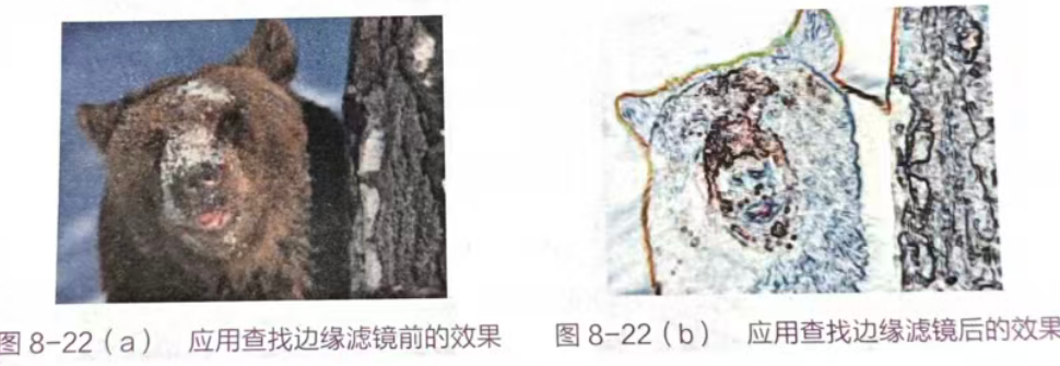 查找边缘滤镜会自动查找选区图像中明显过渡的区域并强化边缘像素,将高反差区域用深色线条勾画,低反差用两色表示,得到选区的图像轮廓。运用查找边缘滤镜前后的不同效果如图 8-22 所示。