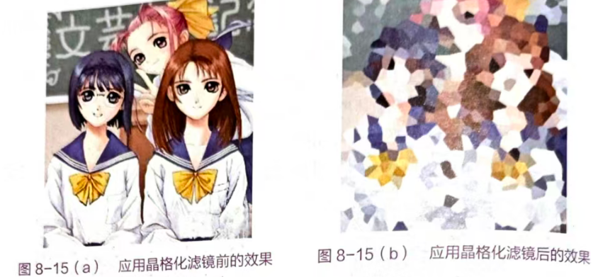 晶格化滤镜会将选区图像中颜色相近的像素合并到单色的多边形单元格中,使图像简化成由色块组成的类似拼贴图的效果。在参数中,通过设置单元格大小来调整结块单元格的尺寸,范围是 3 到 300。值越大,单元格的尺寸越大,图像简化程度越明显。运用晶格化滤镜前后的不同效果如图 8-15 所示。