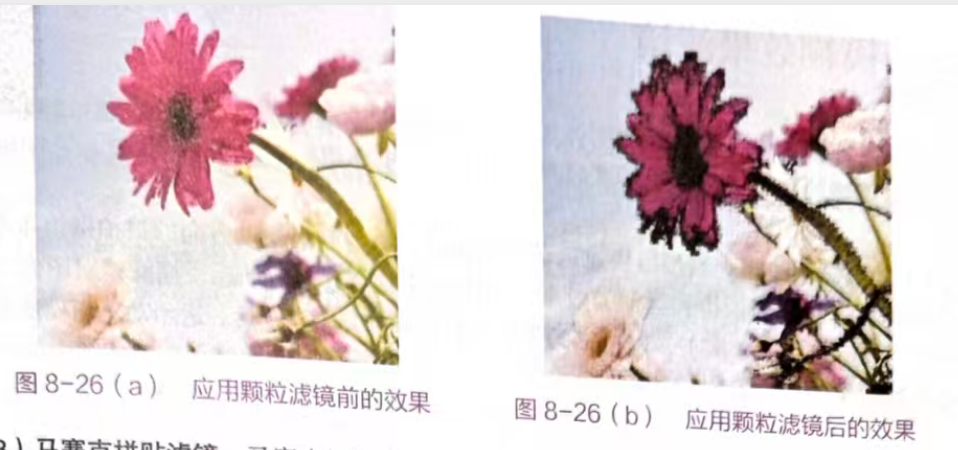 颗粒滤镜模拟不同的颗粒(常规、软化、喷洒、结块、强反差、扩大、点刻、水平、垂直和斑点)纹理添加到图像的效果。运用颗粒滤镜前后的不同效果如图 8-26 所示。