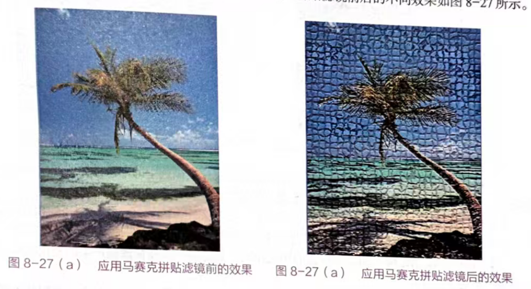 马赛克拼贴滤镜将图像划分为有缝隙的小图块,使图像看起来由方形的拼贴块组成,而且图像呈现出浮雕效果。运用马赛克拼贴滤镜前后的不同效果如图 8-27 所示。