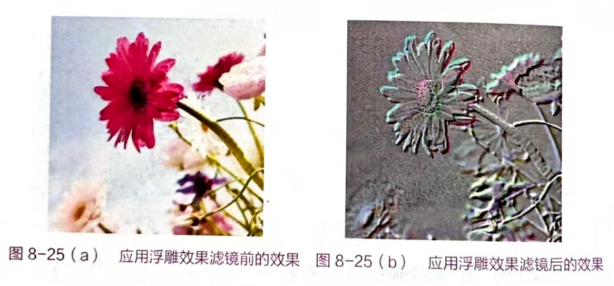 浮雕效果滤镜通过将选区图像的填充颜色转换为灰色,并用原填充色勾画边缘,来使选区显得凸出或凹陷,产生浮雕的效果。图像对比度越大的图像浮雕的效果越明显。浮雕效果是通过将选区的填充色转换为灰色,并用原填充色描画边缘,从而使选区显得凸起或压低。浮雕效果滤镜选项包括浮雕角度(-360 度至 + 360 度,-360 度使表面凹陷,+360 度使表面凸起)、高度和选区中颜色数量的百分比(1% 至 500%)。要在进行浮雕处理时保留颜色和细节,请在应用浮雕滤镜之后使用 "渐隐" 命令。运用浮雕效果滤镜前后的不同效果如图 8-25 所示。