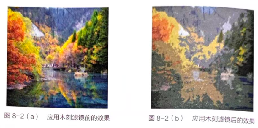 木刻滤镜通过把图像中所有颜色均匀简化为少数几种颜色来创建图形的轮廓,效果类似于拼贴画或木刻版画。在参数设置对话框中,色阶数的值决定了简化的颜色层次;简化度的值决定了图像边缘色块的简化程度;边缘逼真度数值决定了简化图像的逼真程度。运用木刻滤镜前后的不同效果,如图 8-2 所示。