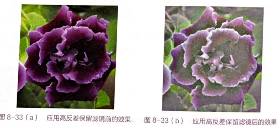 高反差保留滤镜会将图像反差明显的区域内的边缘细节保留,而将图像的其他部分隐藏。其调节参数为 Radio 半径:控制保留范围的大小。值越大,保留原图的边缘细节越多。运用高反差保留滤镜前后的不同效果如图 8-33 所示。