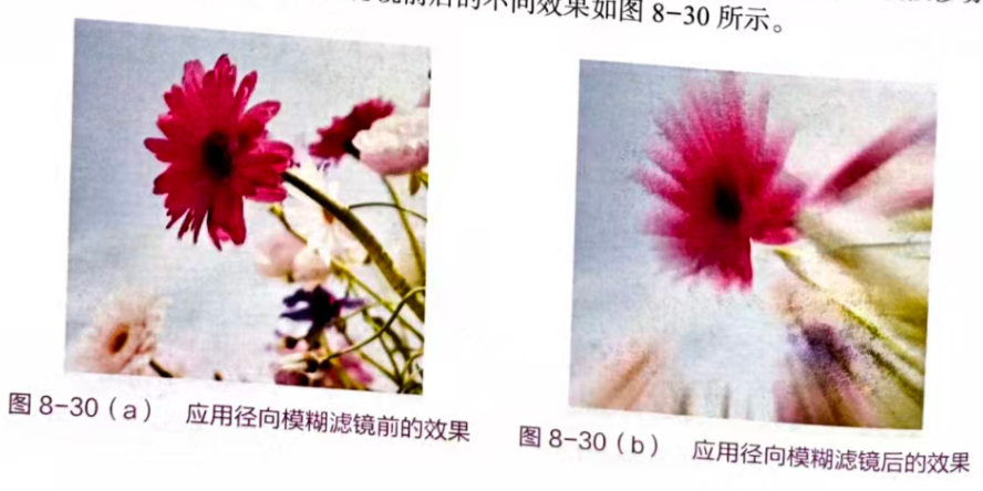 当用变焦方式拍摄运动物体时,被拍摄物体四周会产生放射状的模糊影像,或在曝光过程中轻微旋转相纸产生的圆形模糊影像。径向模糊滤镜就是模拟移动或旋转的相机产生的模糊。运用径向模糊滤镜前后的不同效果如图 8-30 所示。