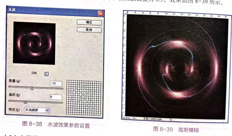 (6)执行 "滤镜 --- 扭曲 --- 水波" 命令,设置水波 "数量" 值为 - 16,"起伏" 值为 6,样式为 "水池波纹",参数设置如图 8-38 所示。