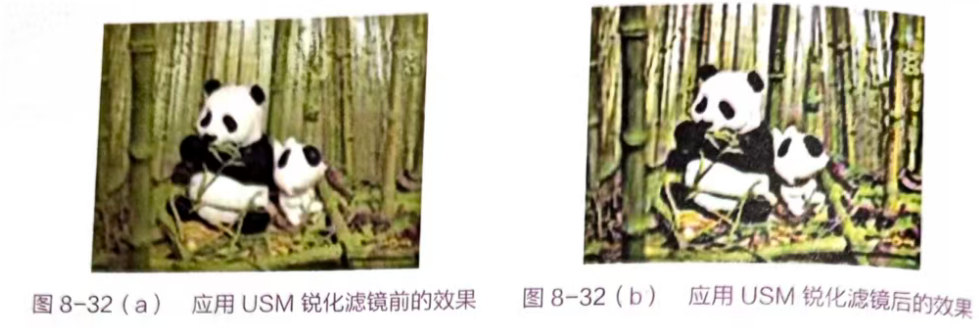 USM 锐化滤镜可以手动调整图像的边缘对比度,结果会在边缘的两侧产生更亮和更暗的线条,使图像更加清晰。参数中 Threshold 值是指定相邻像素之间的比较值。当阈值设置在低值时,具有较小对比度的边缘也会被强调;阈值过高时,会强调图像中已经有明显差异的边缘。运用 USM 锐化滤镜前后的不同效果如图 8 - 32所示。