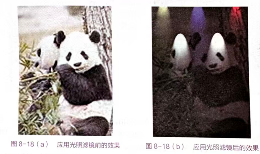 光照滤镜可以通过选择不同的光源、光照类型和光线等属性来为图像添加不同的光线效果。此滤镜不能应用于灰度模式、CMYK 色彩模式和 Lab 色彩模式的图像。此滤镜自带了 17 种灯光样式,灯光类型有 3 种可供选择,是点光、平行光和全光源。此滤镜功能比较强大,运用光照效果滤镜前后的不同效果如图 8-18 所示。