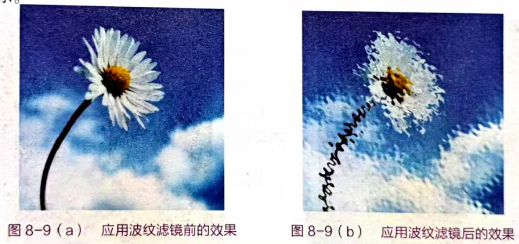 波纹滤镜可以在选取图像上创建起伏的图案,使图像产生类似水波纹的效果。波纹滤镜主要调节选项包括:数量 ------ 控制波纹的变形幅度,范围是 - 999% 到 999%;大小 ------ 有大、中和小三种波纹可供选择。运用波纹滤镜前后的不同效果如图 8-9 所示。