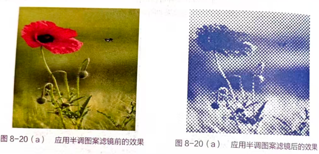 半调图案滤镜用前景色和背景色两种颜色,模拟半调网屏的效果,且保持连续的色调范围。使用半调图案滤镜可以在图案类型中选择圆圈、网点和直线三种图案类型。运用半调滤镜前后的不同效果如图 8-20 所示。