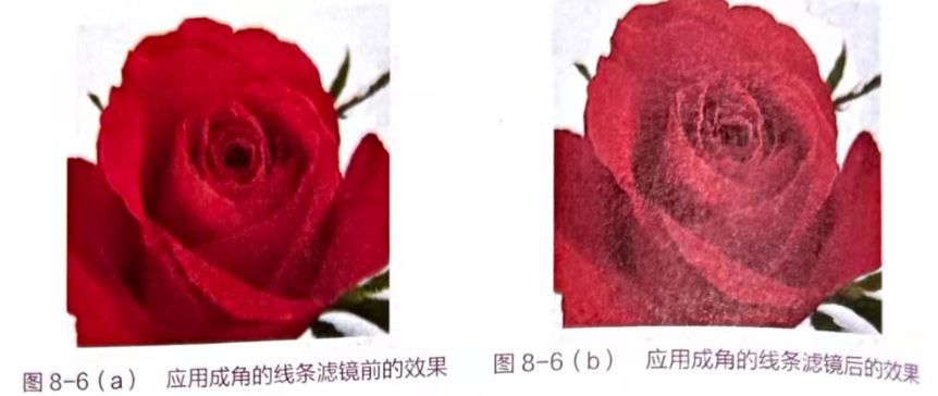成角的线条滤镜通过为图像产生交叉网线来模拟钢笔画素描效果。在滤镜参数设置中,通过调节方向平衡的值来控制两种交叉线的比例,当值大于 50 时,主要为 "|" 线条,小于 50 时,主要为 "\" 线条;线条长度值用来控制线条的长度;锐化程度值用来控制线条的锐利程度,值越小,线条的饱和度就越低,线条之间的反差就降低,图像就越模糊、柔和。运用成角的线条滤镜前后的不同效果如图 8-6 所示。