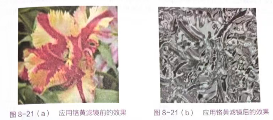 铬黄滤镜将图像处理成银质的铬黄表面效果。亮部为高反射点,暗部为低反射点。运用铬黄滤镜前后的不同效果如图 8-21 所示。
