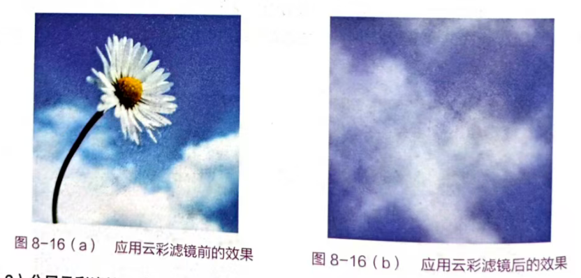 云彩滤镜使用介于前景色和背景色之间的随机值生成柔和的云彩效果,如果按住 Alt 键使用云彩滤镜,将会生成色彩相对分明的云彩效果。运用云彩滤镜前后的不同效果如图 8-16 所示。