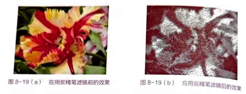 炭精笔滤镜用前景色描绘图像中的暗部区,用背景色描绘亮部区,从而产生不同的纹理,用来模拟炭精笔的纹理效果。运用炭精笔滤镜前后的不同效果如图 8-19所示。
