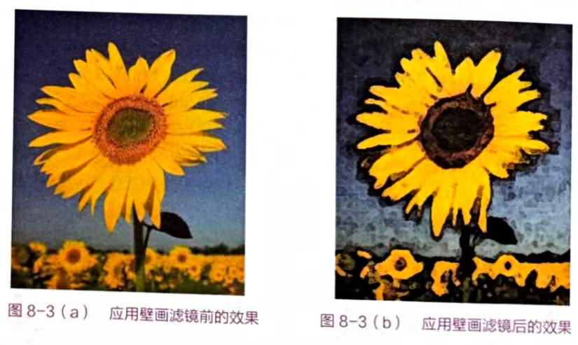 壁画滤镜通过在图像中加入大量的黑色斑点,模仿在潮湿的墙上绘制的古壁画效果。在对话框中通过调节画笔大小来控制模仿壁画的画笔粗细;通过画笔细节来控制壁画的细腻程度;通过调节纹理来控制壁画效果颜色之间的柔和程度。运用壁画滤镜前后的不同效果如图 8-3 所示。